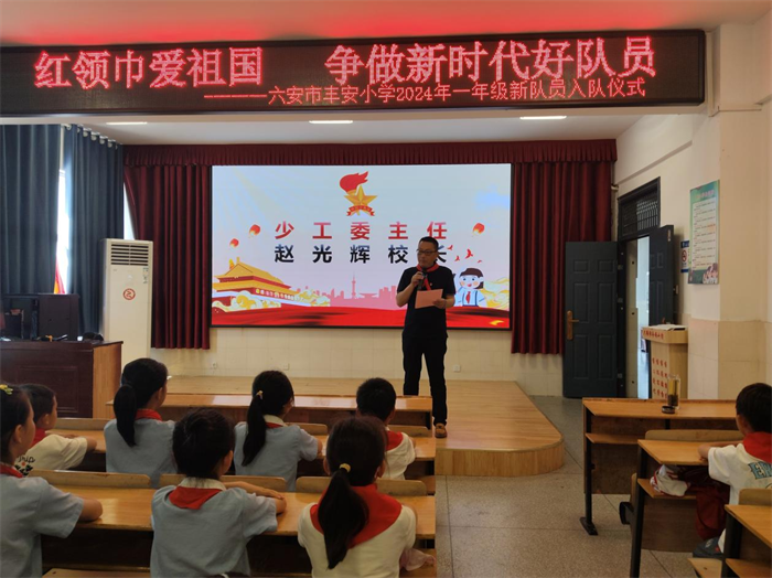 仪式上,六安市丰安小学党支部书记、校长赵光辉发表了热情洋溢的讲话,他首先对新入队的小朋友们表示热烈欢迎和祝贺,鼓励他们在少先队这个大家庭中,学习更多的知识,培养良好的品德,成为德智体美劳全面发展的社会主义建设者和接班人。同时,他也对孩子们提出了期望,希望他们能够继承和发扬少先队的光荣传统,从小树立远大理想,为实现中华民族伟大复兴的中国梦不懈奋斗。