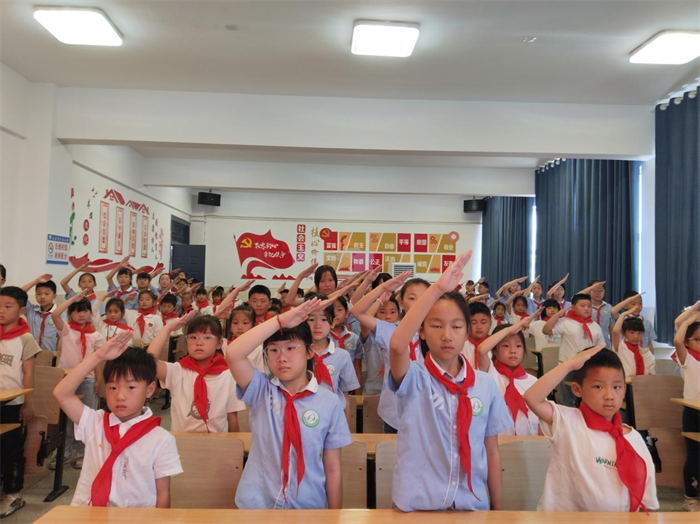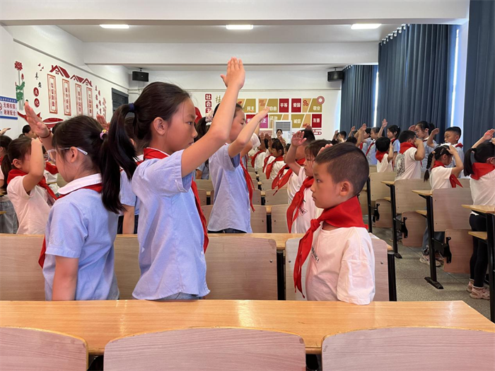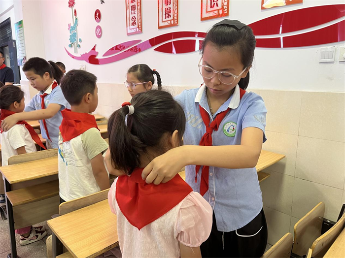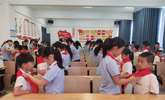 随后,高年级的少先队员们为一年级的新成员系上了鲜艳的红领巾。红领巾,作为少先队员的标志,不仅代表着荣誉,更是一种责任与使命的传承。新队员们面对队旗,庄严宣誓,用稚嫩而坚定的声音表达了他们对祖国的热爱和为共产主义事业奋斗的决心。