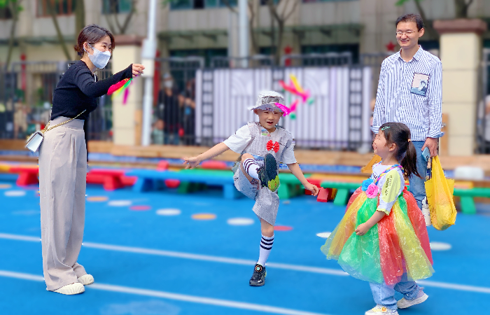 不同的童年,相同的快乐。父母的童年可能是蛙声一片的稻田,穿山涉水的阳光花草,夏日闪烁的夜星与萤火虫,还有伴随他们整个童年的经典游戏。为了让家长和幼儿沉浸式体验八零、九零年代的童年,中市幼儿园精心策划,认真准备了挑棍、跳皮筋、滚铁环、投沙包、摸瞎子、踢毽子等游戏项目,让他们重温童真。