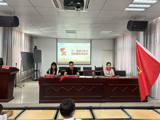 伴随着激情昂扬的出旗曲,旗手和护旗手迈着整齐坚定的步伐出旗。全体少先队员们目光坚毅,注视着鲜艳的队旗,齐声高唱队歌。大队辅导员王大瑞宣读了一年级新队员名单,并祝贺他们正式成为光荣的中国少年先锋队队员,为学校少先队组织注入了新鲜血液。当听到自己的名字,新队员脸上洋溢着骄傲的笑容。