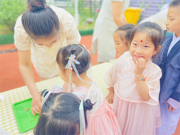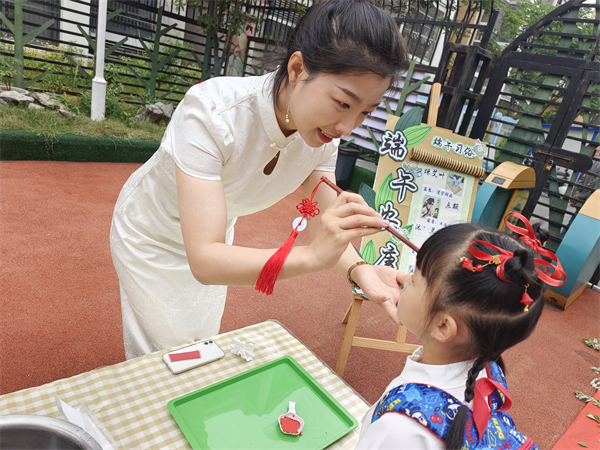一早,孩子们身着各种各样的服饰兴高采烈地步入幼儿园,开启了踩艾叶、画额面、“沐”艾汤、系五彩绳等不同寻常的入园仪式。