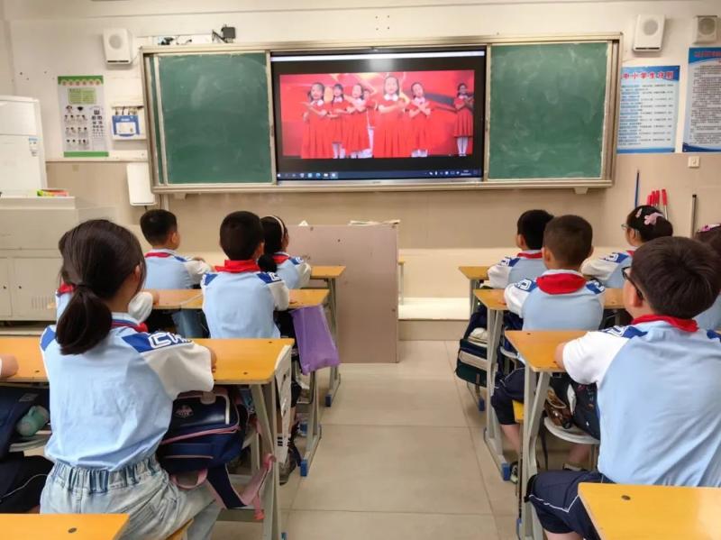 在连线观看共建学校节目的过程中,六安市人民路小学各中队的同学们聚精会神,不时发出阵阵掌声。他们被上海市松江区九里亭外国语实验学校同学们的表演所感染,感受到了两所学校之间的深厚友谊和共建成果。