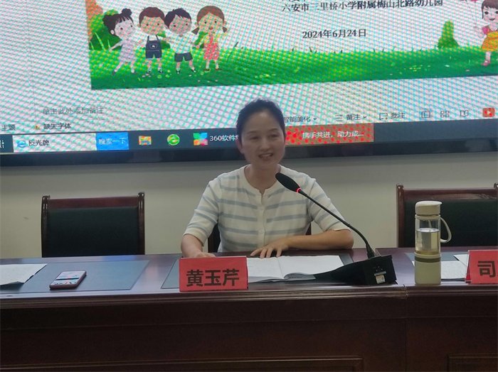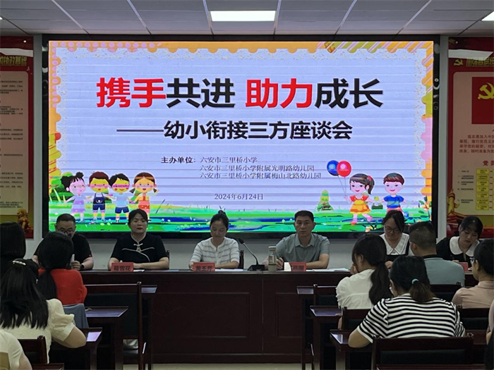 为了加强幼儿园、小学和家长三方之间的沟通与交流,共同做好幼小衔接工作,6月24日下午,六安市三里桥小学一校两园幼小衔接座谈会在光明校区党员会议室如期举行。参与本次座谈的有六安市三里桥小学校长司恩国、办公室主任黄玉芹、教导处副主任葛雪花、光明路幼儿园园长周正转、梅山北路幼儿园园长方雨以及部分教师和家长代表。活动由办公室主任黄玉芹主持。