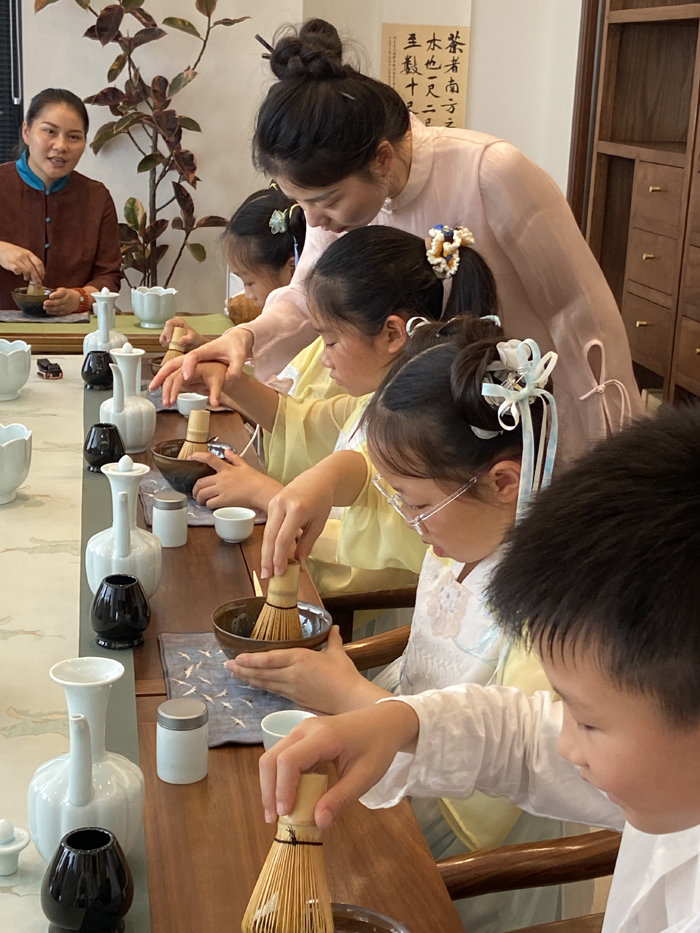 宋代点茶重现,书写心灵世界。顾修莉老师为孩子们讲解了宋代点茶的操作方式,点茶这种古代沏茶方式,引起同学们很大的兴趣。同学们学得特别认真,轻执茶筅,击拂乳花、沫饽。一茶勺的粉末茶分七次注水,七次搅拌,尽管手腕酸疼,却没有一个人放弃,大家专注做事的样子展示出新时代少年的风采。最后,顾老师引导同学们在点出的沫浡上写字、作画。孩子们仿佛成为了小小艺术家,用茶汤书写着自己的心灵世界,身心俱融于点茶的独特魅力之中。