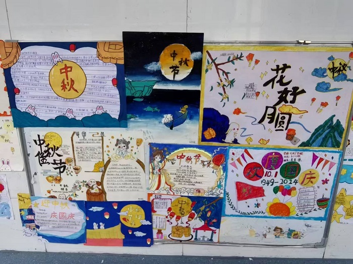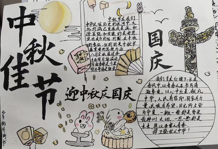 为迎接双节,学校举办了以中秋国庆为主题的手抄报、书法和诗歌朗诵比赛。在手抄报创作中,同学们用绚丽的色彩和生动的画面展现中秋的团圆与国庆的喜庆;书法作品则或刚劲有力,或飘逸灵动,一笔一划尽显汉字之美;诗歌朗诵环节,同学们以饱满的热情、标准的普通话朗诵着一首首赞美祖国、歌颂团圆的诗歌,声情并茂,令人动容。