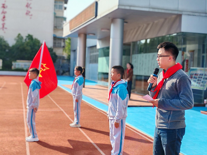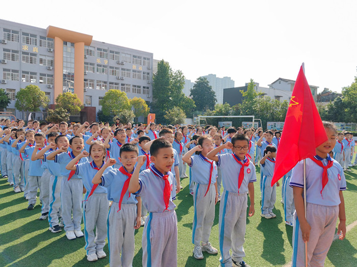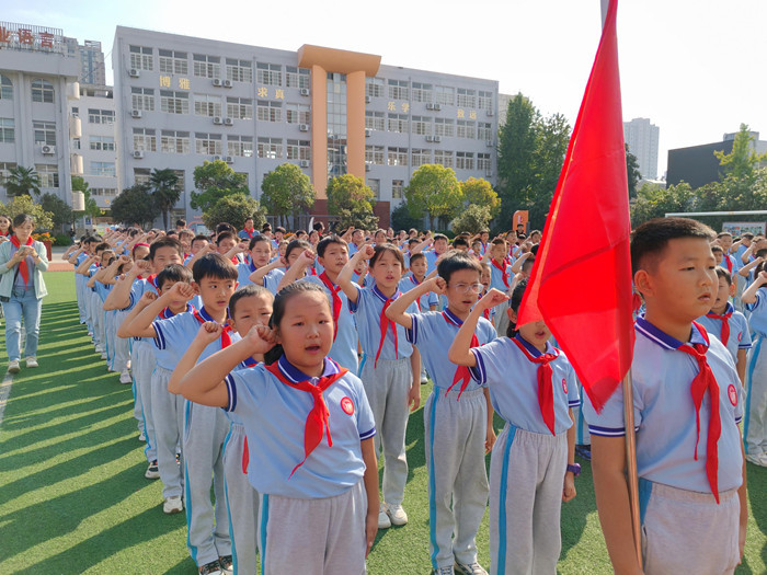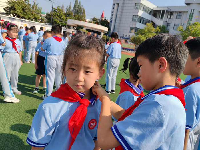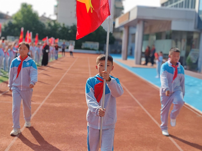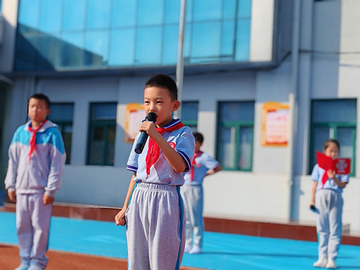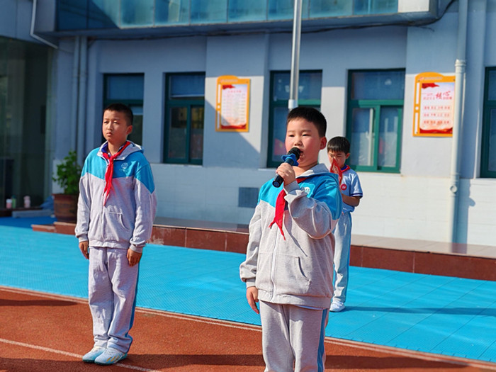 随着鼓号队激昂的演奏,队旗在护旗手的护卫下缓缓入场,那抹鲜艳的红色在阳光下熠熠生辉,引领着每一位少先队员的心向队旗靠拢。嘹亮的《中国少年先锋队队歌》响彻校园,每一个音符都跳跃着少先队员们的坚定信念与豪迈情怀,那是对祖国的深情告白,也是对未来的无限憧憬。