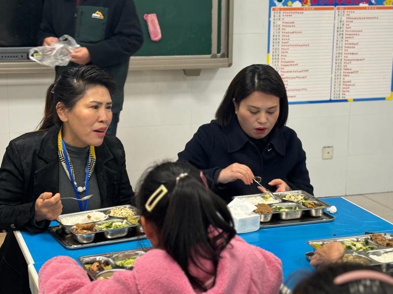 中午就餐时,视察组一行来到该校三(1)班开展陪餐活动,与孩子们面对面交流,了解孩子们的就餐情况。通过亲身体验,视察组对皋城小学的学生膳食情况给予了高度认可。