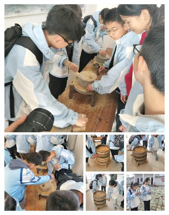 同学们认识擂米工具,体验劳作的辛苦与不易,生活中珍惜爱护粮食;弘扬农耕文明,传承非遗文化。