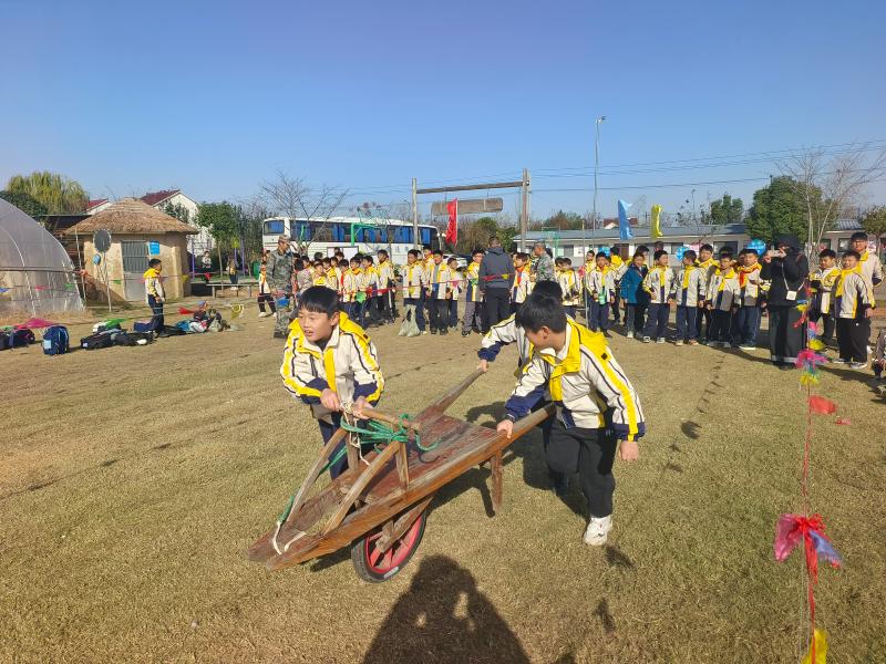 首先是独轮车运粮比赛。在基地工作人员的安排下,孩子们摩拳擦掌,男女生搭配,女生装袋,男生几人一组推着装着粮食的独轮车,同学们谁也不服输,赢得围观同学们阵阵喝彩,深刻体会到祖先辛苦劳动的不易!