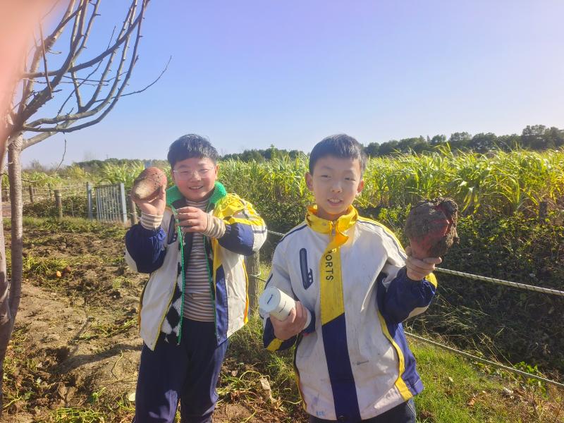 红薯地里热闹非凡,时不时的就听到田间地头此起彼伏的声音在喊:“哇,我挖到了!”、“看我的最大”......一个个身披大红袍,歪着小脑袋,神气活现地看着外面这个新鲜的世界,那样子真是惹人喜爱。孩子们像捧宝贝似的,连忙分享收获的喜悦……