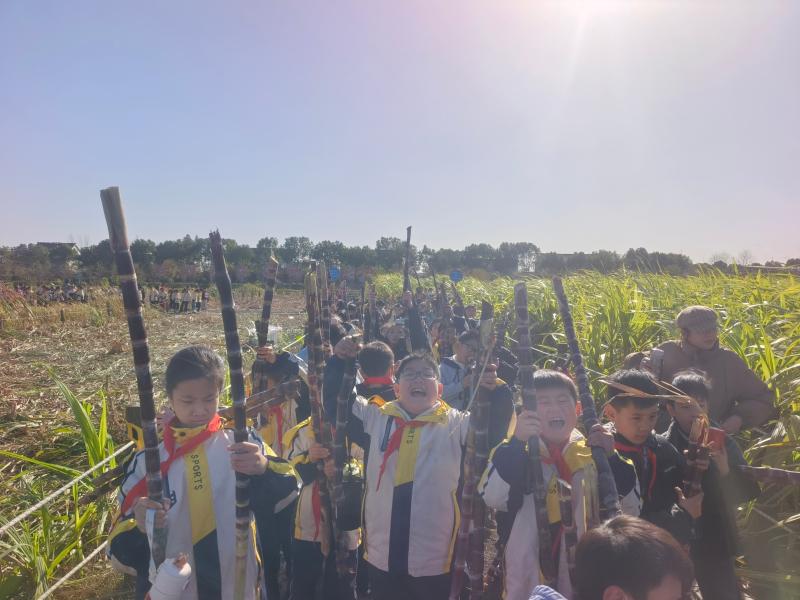 成片的甘蔗挺拔而茂密,阳光下泛着淡淡的光泽。学生们在老师的指导下,分成小组,有条不紊地进行着甘蔗的收割工作。他们戴着劳动手套,或是挥动镰刀,或是用力拉扯,脸上都洋溢着满足和喜悦的笑容。