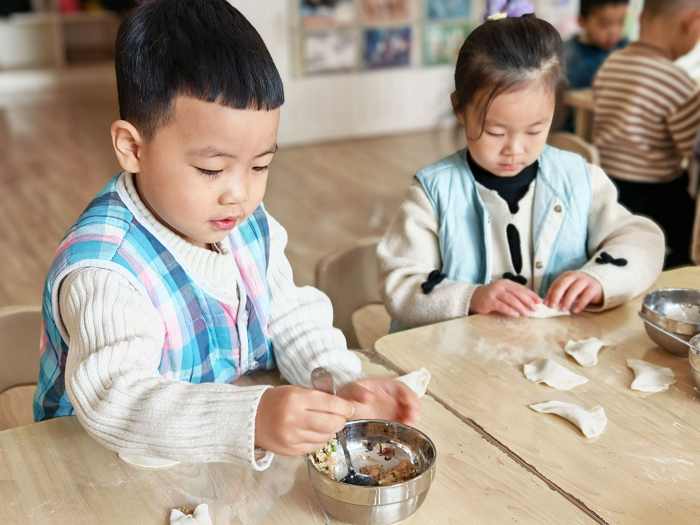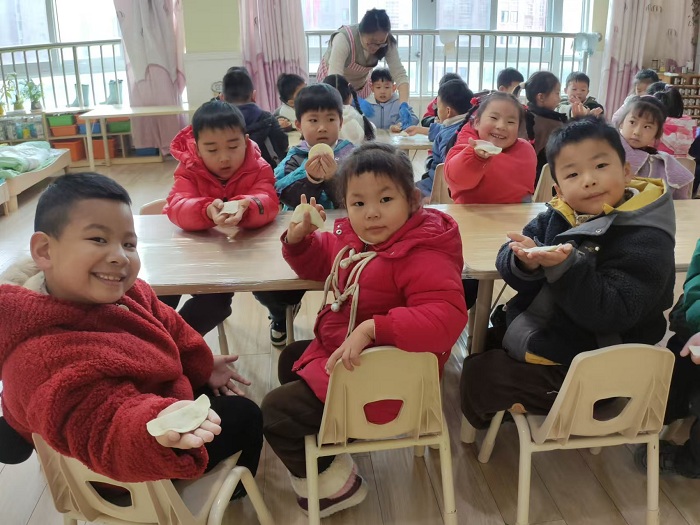 与此同时,中班师幼则围坐在一起,热火朝天地包起了饺子。老师先给幼儿讲解了饺子的来历和寓意,然后示范了包饺子的方法。孩子们一边认真听讲,一边动手实践,很快就掌握了包饺子的技巧。当一盘盘形态各异的饺子摆满桌面,看着自己亲手包出的饺子,孩子们都感到非常自豪和开心,那是孩子们送给冬至最美好的礼物。