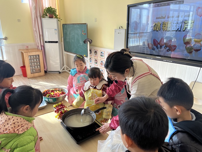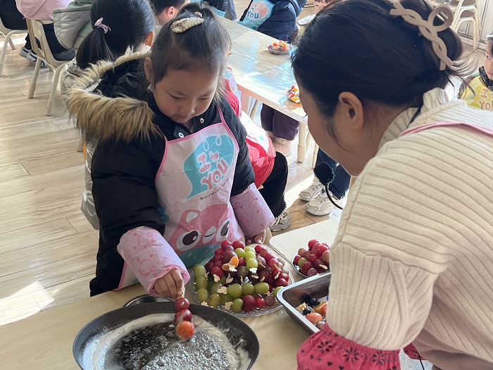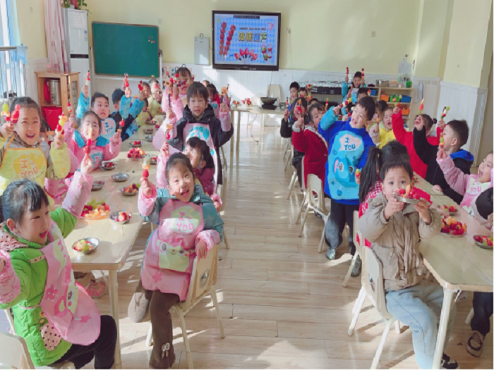 而大班的活动现场则弥漫着香甜的气息。孩子们先卷起衣袖,亲手清洗一颗颗红彤彤的山楂、草莓、蓝莓、提子、圣女果、橘子等水果,再精心串在竹签上,宛如一串串诱人的“宝石”。接着,小心翼翼地将老师熬制好的糖浆迅速均匀地浇在水果串上,瞬间,糖浆冷却凝固,晶莹剔透,散发着甜蜜的光泽。孩子们迫不及待地拿起糖葫芦,轻轻咬上一口,甜蜜的滋味在舌尖散开,他们的脸上绽放出幸福的笑容,快乐在彼此心间传递。