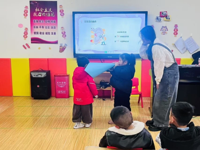 大班开展了“护耳小卫士”创意行动:幼儿动手制作“护耳提示牌”(如“轻声说话”“远离鞭炮”),布置班级“护耳角”;开展“声音辨辨乐”游戏,分辨安全与危险声音,强化自我保护意识。