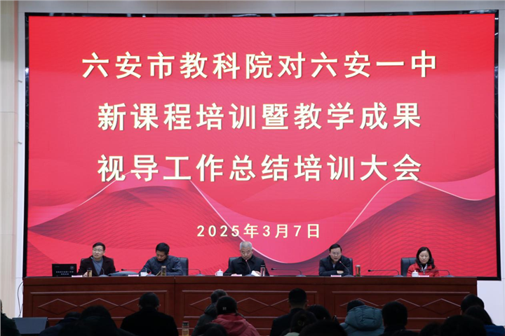 2025年3月7日下午,六安一中在图书馆二楼报告厅召开新课程培训暨教学成果视导工作总结培训大会。六安市教科院院长孔庆东、六安一中校长经怀德、市教科院副院长齐永成、胡晓林,副校长鲍远春及全体参训教师参会。会议由经怀德校长主持。