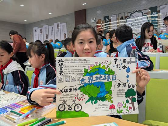 在限时20分钟的手抄报创作环节,学生们充分发挥奇思妙想,以画笔为媒,以纸张为介,用绚丽的色彩、独特的构图和真挚的文字,在手抄报上描绘出地球的壮美风光,展现环境污染的严峻现状,表达对地球的无限热爱和守护地球的坚定决心。一幅幅精美的作品,承载着孩子们对地球家园的深情与担当。