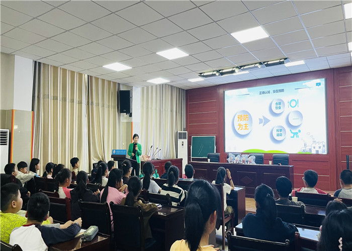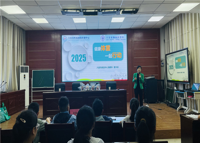 活动伊始,六安市疾病预防控制中心慢性病科科长曹洪娟带来的健康知识讲座。讲座以“体重管理年”为主题,从专业角度阐释了体重与健康的紧密关联,BMI体重指数意义及计算方法。超重和肥胖如何增加心血管疾病、糖尿病、某些癌症的患病风险。在传授科学体重管理方法时,详细讲解了合理饮食的要点,如每日应摄入的谷类、蔬菜、水果、蛋白质的量,以及如何巧妙应对高热量食物的诱惑;在运动锻炼方面,给出了适合不同年龄段和身体状况师生的运动建议,以及满足小学生睡眠时间,引导大家开启健康生活新方式。