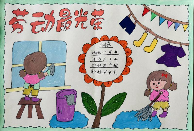 手抄报创作:创意与劳动的碰撞。在手抄报创作环节,学生们充分发挥自己的想象力和创造力,用五彩斑斓的画笔描绘出他们心中对劳动的理解。作品图文布局合理、色彩协调,更充满了童真和创意。从精美的插画到工整的文字,每一幅作品都展现了学生们对劳动的热爱和对美好生活的向往。这些作品不仅记录了学生们对劳动的认知,也成为了校园文化建设中一道亮丽的风景线。