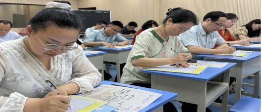本次大赛采用现场竞技的形式,涵盖钢笔字、粉笔字、毛笔字三大项目。赛场上,教师们凝神聚气、挥毫泼墨,以笔为刃,尽显教学基本功的扎实与灵动。钢笔字书写时,笔尖与纸张轻触,流畅笔锋间尽显工整与力道。毛笔字创作中,墨香萦绕宣纸,古朴笔韵间流淌文化底蕴。粉笔字展示上,黑白碰撞间,规范板书勾勒知识轮廓。