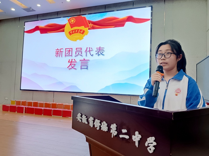 青春向团,逐梦前行。九(11)班胡文静、九(14)班夏雨同学分别作为新团员和优秀团员代表发言。他们表示,将以青春之名书写奋斗篇章,以团员之身为中国式现代化挺膺担当!