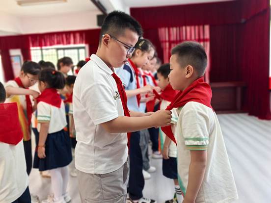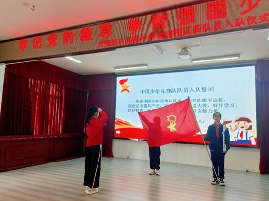 在授红领巾环节,老队员们为新队员佩戴上鲜艳的红领巾。在大队委员赵雨蕊同学的带领下,全体新队员庄严宣誓,充分表达出自己时刻牢记党的教导,争做强国少年的雄心壮志。