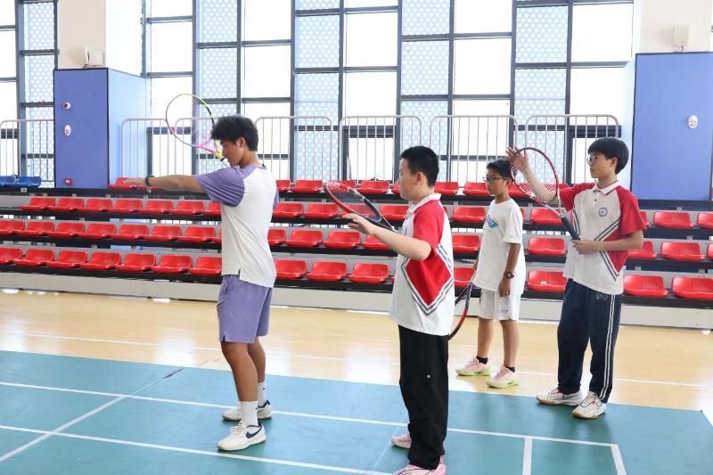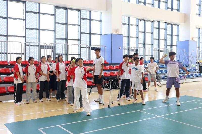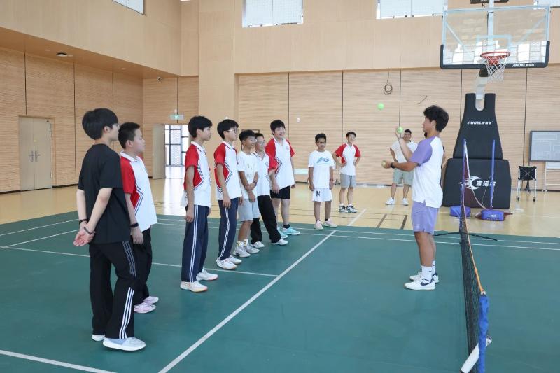 在网球技术动作教学环节,孙键辰、黄瑞杰二人化身专业教练,从握拍姿势、击球动作到脚步移动,都进行了细致入微的讲解与示范。学生们围成一圈,全神贯注地聆听,认真模仿着每一个动作。球员们还走到学生中间,手把手纠正动作,确保学生们能够掌握正确的技术要领。