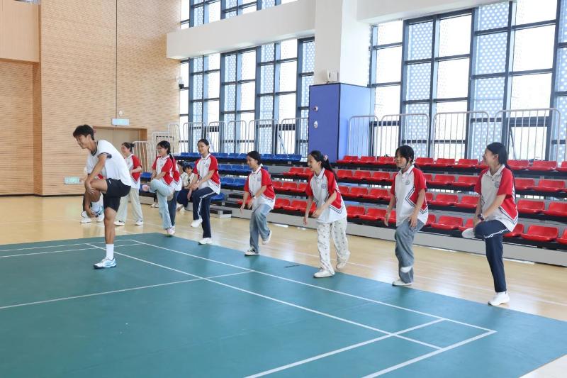 活动伊始,球员们便带领学生们进行分组热身。球员们亲自示范,从简单的关节活动到慢跑拉伸,每一个动作都细致讲解,让学生们充分活动开身体,为接下来的活动做好准备。现场气氛热烈,学生们积极参与,跟着球员们有模有样地活动着。