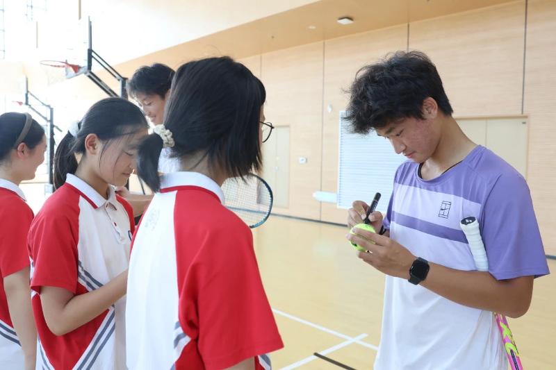 活动的最后,球员们与学生们进行了签名合照。学生们手持网球、球拍,兴奋地排着队,与心目中的偶像近距离接触。球员们热情地为学生们签名,并一起合影留念,记录下这难忘的时刻。活动结束后孙键辰表示:“今天上课的体验非常好,体会到了小朋友们对网球的好奇和热爱,小朋友们上课很开心也很积极,学习氛围很好,希望我们能一起保持对网球的热爱。”黄瑞杰也坦言道:“对学校第一印象很好,校园很整洁,同学们都很有活力,也很认真,大家上课都非常积极,学习网球很有天赋。”皋城中学南山校区七年级学生陈金杰说道:“在参加这次活动之前,我对网球最初的认识就是看中国队郑钦文比赛,这次活动教练们手把手教我们打球,让我感到很兴奋,也喜欢上了这项运动,希望以后能把网球打好。”