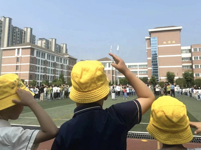 早晨9点,伴随着嘹亮的《运动员进行曲》,幼儿园小朋友们整齐列队来到操场,和哥哥姐姐们一起参加升旗仪式。当雄壮的国歌声响起,孩子们学着少先队员的样子行注目礼,稚嫩的小脸上写满了庄重。“看到五星红旗升起来的时候,我的心里暖暖的。”大班小朋友轩轩这样说道。
