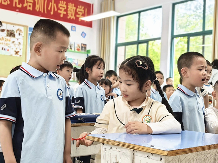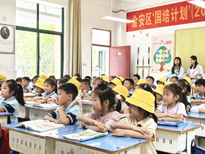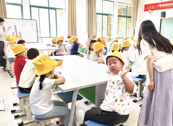 随后,孩子们继续实地参观。在一年级教室中,幼儿们参与了拼音游戏课。老师将抽象的“bpdq”变成会跳舞的磁贴娃娃,孩子们用身体摆出字母造型,在《拼音王国寻宝》游戏中轻松认读。课堂结束后,小朋友们围坐在哥哥姐姐身边,提出了许多可爱的问题:“小学的午睡时间有多长?”“小学都有什么课呀?”一年级学生耐心地解答,还分享了自己刚入学时的小故事。