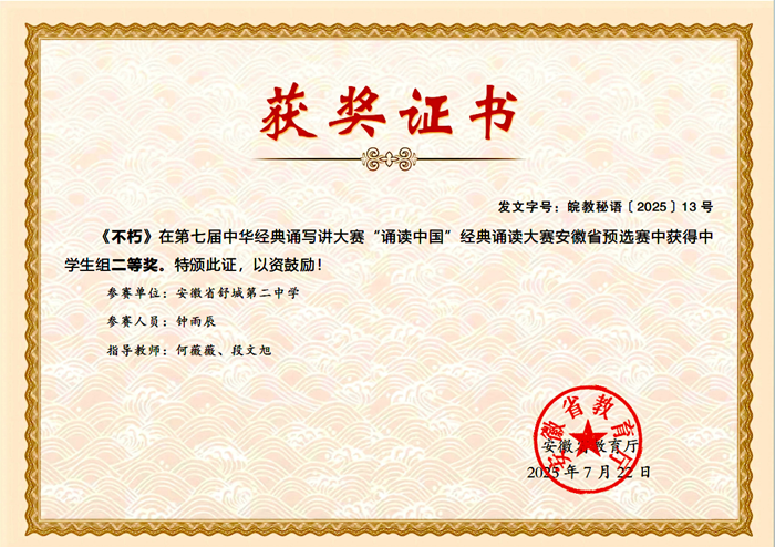 近日,在第七届中华经典诵写讲大赛安徽省预选赛中,舒城二中七(11)班钟雨辰同学的诵读作品《不朽》,经过专家层层评审,凭借出色的诵读表现,荣获经典诵读大赛省二等奖并晋级国赛。