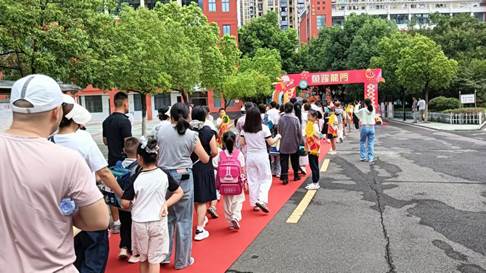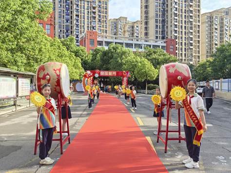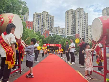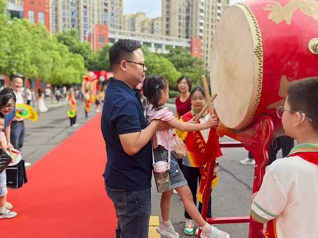 仪式在“击鼓鸣志”的鼓声中隆重拉开帷幕。一群群天真可爱的萌娃们在家长的带领下,怀着满眼的新奇步入校园,踏上红毯。小朋友们舞动着稚嫩的双手,用力敲响入学第一槌,击鼓明志,表达着自己昂扬向上、志存高远的雄心壮志。