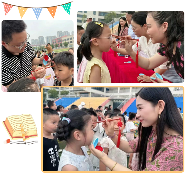 启智慧・立远志。“拜师行礼”——全体新生面向老师们,深深鞠躬,稚嫩的动作里满是真诚;老师们则微笑回礼,用温和的目光回应孩子们的敬意。这一敬一回间,不仅传承了中华传统文化中“尊师重道”的美德,更拉近了师生间的距离,孩子们感受到了老师的亲切与温暖。“朱砂启智”——老师们手持蘸满朱砂的毛笔,在孩子的额头正中央轻轻点下一个红痣。“这是‘智慧痣’,点了之后就要变得更聪明哦!” 老师温柔的话语让孩子们的小眼睛变得亮晶晶的。 小小的红痣承载着学校对孩子们“开启智慧、健康成长”的美好祝愿。