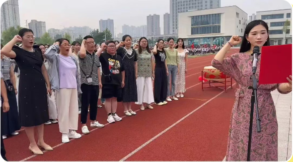 齐宣誓・赴未来。全体教师在高贝副校长的带领下庄严宣誓,神情庄重,右手举拳,面向国旗,许下了掷地有声的铮铮誓言。赵家栋同学带领全体学生庄严宣誓,誓言铿锵有力,字字句句凝聚着新时代好少年的信念与担当。