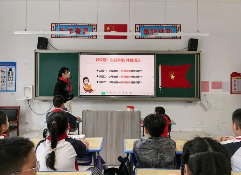 队会课上,各中队围绕 “法治伴我行” 主题,开展了形式多样的教育活动。中队辅导员们通过生动的 PPT、法治小故事、案例分析等方式,向队员们讲解了与未成年人密切相关的法律知识,如《中华人民共和国未成年人保护法》《中华人民共和国预防未成年人犯罪法》等。