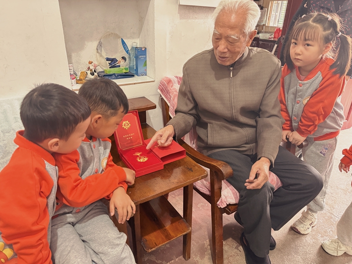 徐爷爷慈祥地拉着孩子们的小手,询问孩子们的学习、生活情况,并用简单易懂的语言,讲述了当年志愿军叔叔们保家卫国的故事。徐爷爷还给给孩子们展示了获得的勋章,那是记录着真实勇敢故事的“荣誉之星”。徐爷爷语重心长地叮嘱小朋友:要好好学习,天天向上,担负起建设祖国未来的重任。