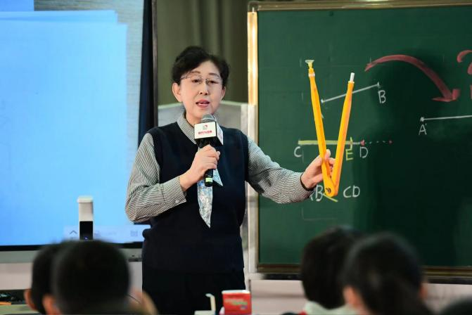 吴正宪老师以新课标、新教材新增内容《尺规作图》为例,向现场的各位老师示范了如何用无刻度直尺和圆规作图。教学中,吴老师以“曹冲称象”的经典典故引入等量概念,巧妙地将生活智慧与数学思想相联结。随后,她引导学生使用无刻度尺思考如何测量线段长度,在激发思维挑战的同时,也让学生初步体会到数学方法的严谨与规范。