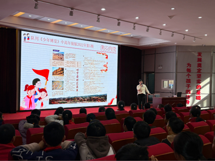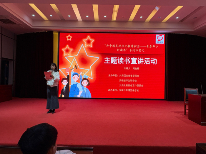本次活动邀请安徽省少先队队刊编辑室主任、《安徽少年博览》杂志社团支部书记刘业楠为主讲人。刘业楠老师作为“为中国式现代化挺膺担当——青春年少好读书”安徽省宣讲团核心成员,走进该校开展公益读书宣讲活动,激发青少年阅读热情,助力书香校园建设。