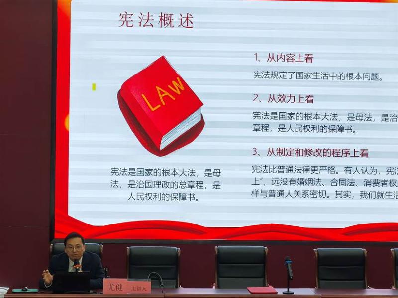 为深入学习贯彻习近平法治思想,迎接第十二个“12·4”国家宪法日,进一步增强全体师生的宪法意识和法治观念,营造尊法学法守法用法的浓厚校园氛围,12月3日下午,在学校党支部与校关工委的指导下,特邀安徽英锐律师事务所高级合伙人、中国社会科学院法律硕士、安徽省律师协会青年律师人才库成员、六安市行政立法和合法性审查咨询论证专家库成员、皖西学院法学院兼职讲师尤健律师,开展以“学习宣传贯彻习近平法治思想,推动宪法深入人心”为主题的法治专题讲座。