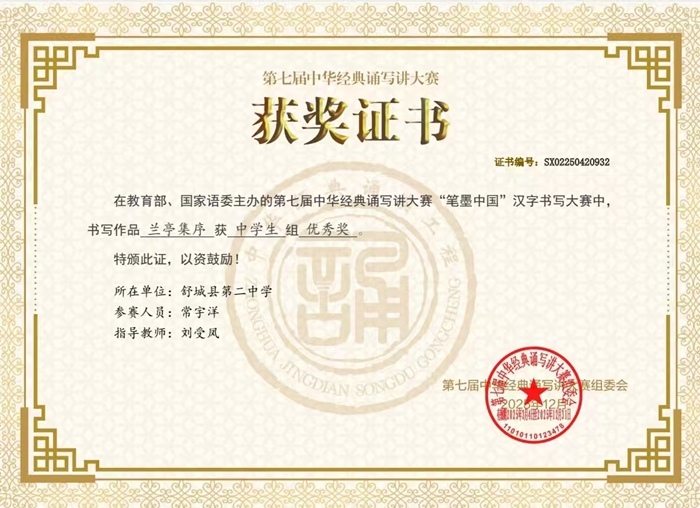 近日,由教育部、国家语委主办的第七届中华经典诵写讲大赛“笔墨中国”汉字书写大赛获奖名单公布。舒城二中选送的九(29)班常宇洋同学硬笔书写作品《兰亭集序》,在安徽赛区初复赛中获中学生组二等奖,并被推荐参加全国决赛,获中学生组优秀奖。