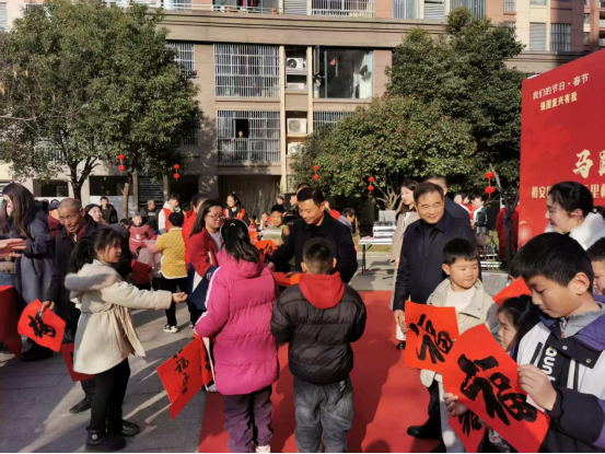 翰墨飘香:手写春联传承文化记忆。文艺表演之外,活动现场另一处焦点春意盎然。志愿服务队中擅长书法的老同志们挥毫泼墨,笔走龙蛇。一副副寓意吉祥、墨香四溢的春联,一个个饱满圆润、气韵生动的“福”字,在他们笔下诞生。这不仅是对传统书法艺术的展示,更是将新春的美好祝愿凝结于方寸红纸之间。裕安区社工部部长李彬,区老年大学党委委员、校长助理李胜,志愿服务队党支部书记朱俊珍等领导亲自将春联和福字分发给社区居民。居民们手捧油墨未干的春联与“福”字,脸上洋溢着喜悦的笑容,浓浓的年味与深厚的文化底蕴在传递中弥漫开来,传统文化以最亲切的方式融入了百姓生活。